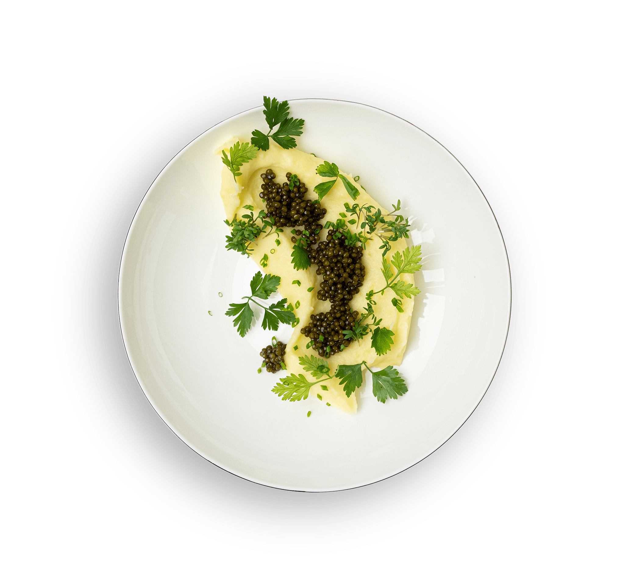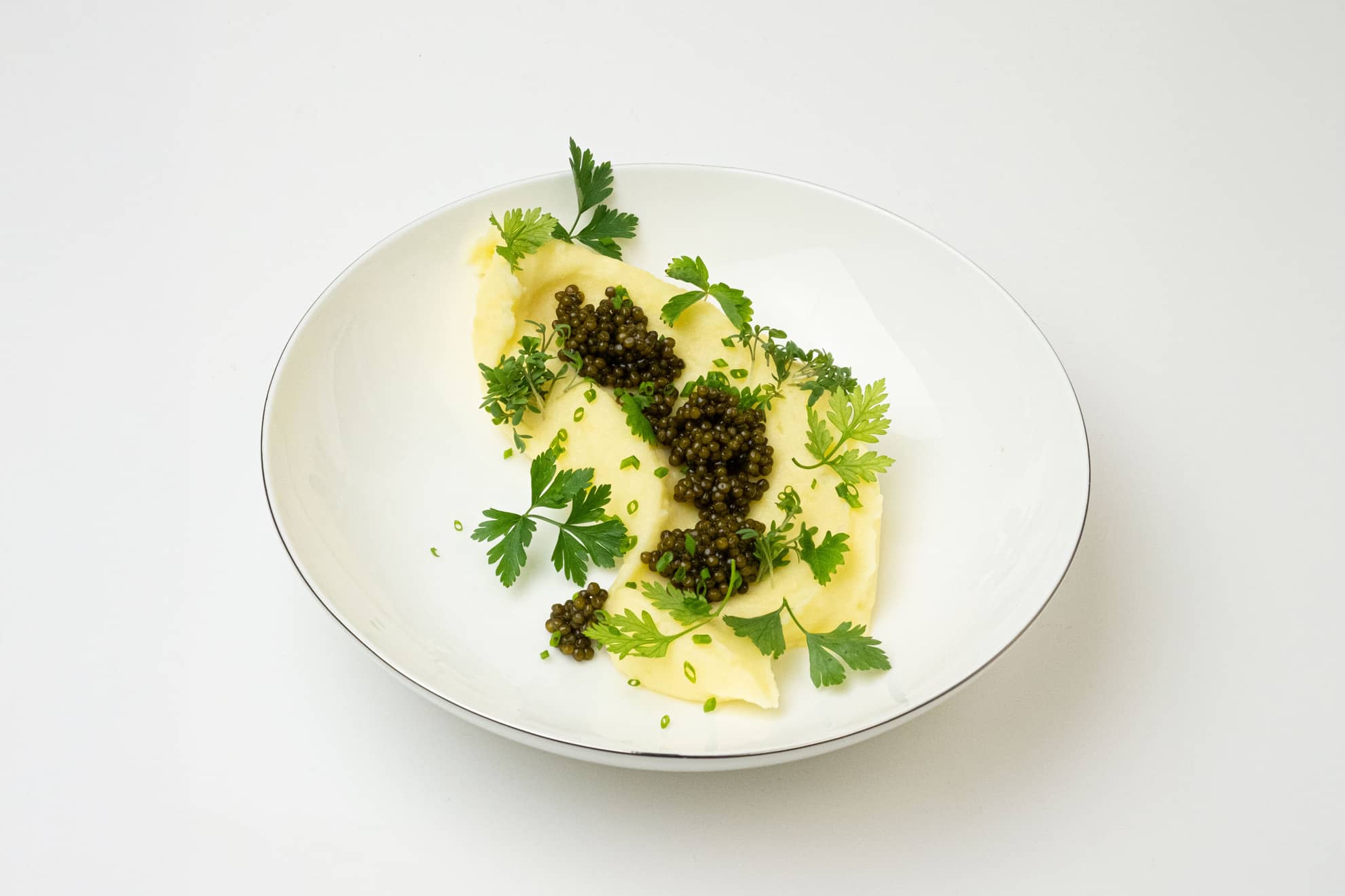 Salzen Sie das Püree nur zurückhaltend, der aromatische Kaviar macht das Gericht rund. Caviar liebt feine grüne Kräuter wie Petersilie, Kerbel und Dill, auch Kresse, Pimpinelle und Borretsch, kombinieren und variieren Sie individuell nach Marktlage und Geschmack. Ausnahmen sind Rauke, Basilikum und Estragon, die das feine Aroma des Kaviars übertönen können.