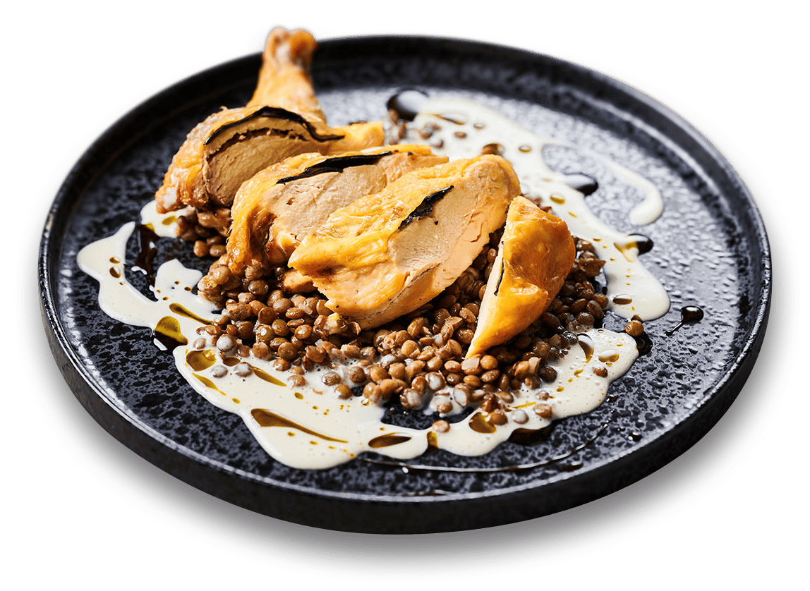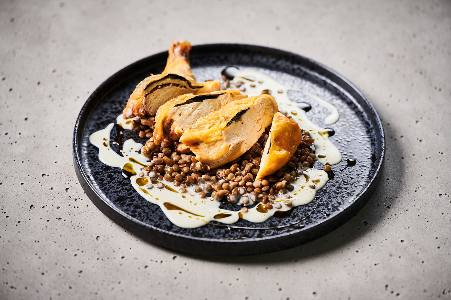 Die Poularden-Brüste aus dem Ofen nehmen und kurz ruhen lassen. Die Sauce erwärmen. Die Linsen auf vorgewärmte Teller verteilen. Die Zahnstocher ziehen, die Brüste aufschneiden und auf die Linsen setzen. Mit Sauce rahmen und optional mit wenigen Schlieren Pistazien Öl finalisieren. Sofort servieren.