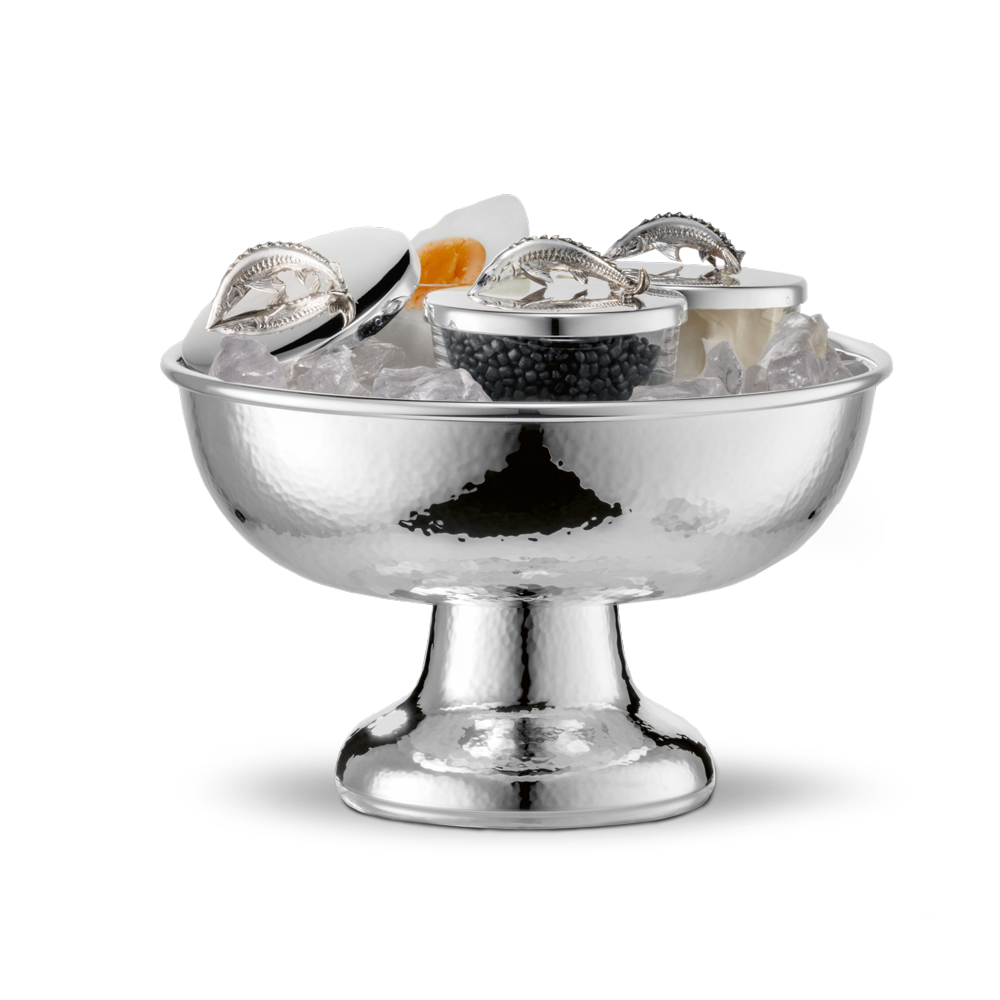 Diese versilberte in Deutschland hergestellt Kaviarschale fällt durch ihre besondere, gehämmerte Oberfläche auf. Die drei Einsätze geben Ihnen die Möglichkeit verschiedene Kaviarsorten gleichzeitig zu genießen.