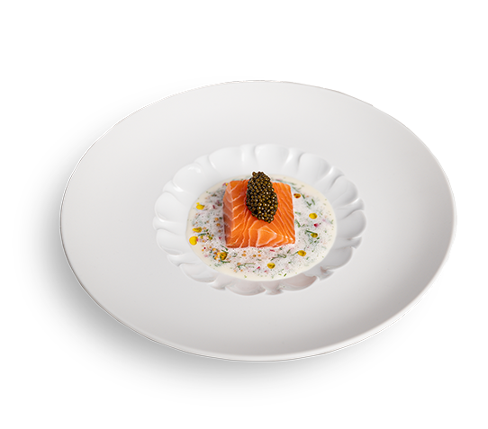 Mit der Einlage und der Buttermilchsauce in tiefen Tellern anrichten und mit einer Nocke Kaviar getoppt servieren.